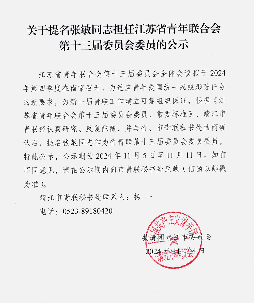 江蘇省青年聯合會第十三屆委員會全體會議擬于2024年第四季度在南京召開。為適應青年愛國統一戰(zhàn)線形勢任務的新要求,為新一屆青聯工作建立可靠組織保證,根據《江蘇省青年聯合會第十三屆委員會委員、常委標準》,靖江市青聯經認真研究、反復醞釀,并與省、市青聯秘書處協商確認后,提名張敏同志作為省青聯第十三屆委員會委員委員,特此公示